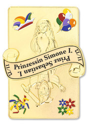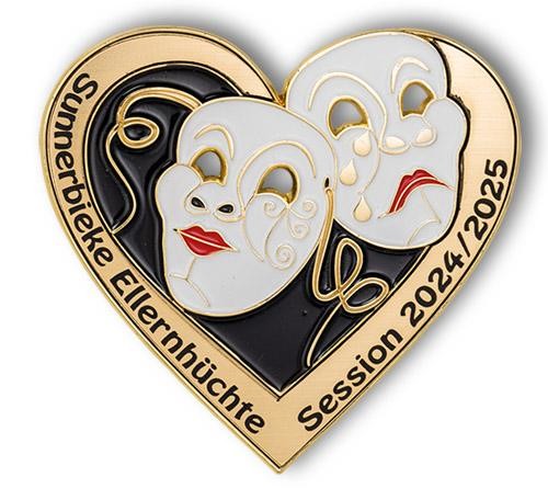 Preisgünstiger Karnevalsorden in den abgebildeten Farben mit Band oder Kordel in Wunschfarbe, individueller Beschriftung und Vereinswappen.
