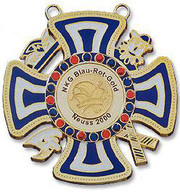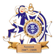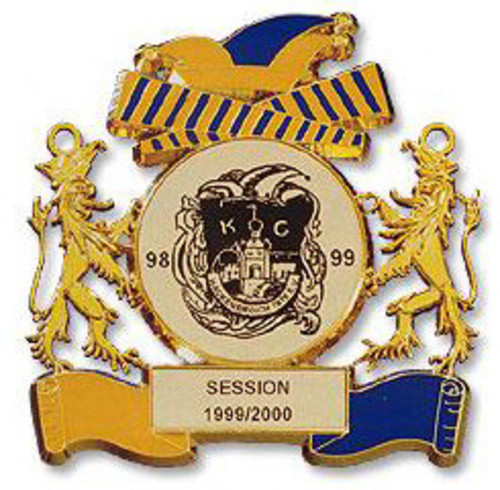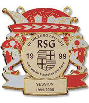 Preisgünstiger Karnevalsorden in Gold und Silber mit Schmuckfarben nach Wunsch, Band oder Kordel in Wunschfarbe, individueller Beschriftung und Vereinswappen.