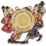 Karnevalsorden in Gold und Silber mit Schmuckfarben wie abgebildet, Band oder Kordel in Wunschfarbe, individueller Beschriftung und Vereinswappen.