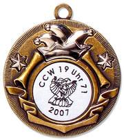 Preisgünstiger Karnevalsorden für Kinder in 3 verschiedenen Farben mit Band oder Kordel in Wunschfarbe, individueller Beschriftung und Vereinswappen.