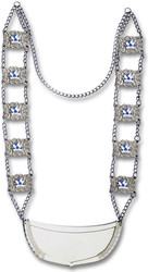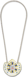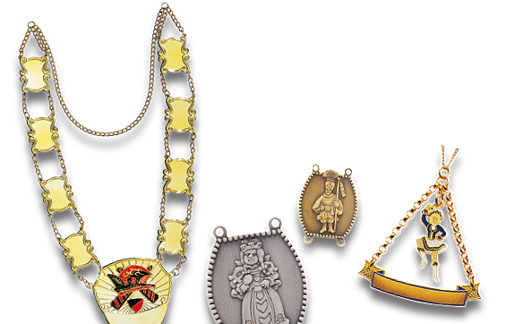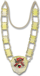 Kette in Gold mit Schmucksteinen, individuellem Wunschtext, Schmuckfarben nach Wahl, Karnevalmotiv und Vereinswappen.