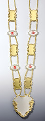 Kette in Altsilber/Gold mit individuellem Wunschtext auf allen Kettenschildern und Vereinswappen.