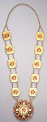 Kette in Gold mit Schmucksteinen, individuellem Wunschtext auf allen Kettenschildern, Schmuckfarben nach Wahl, Karnevalmotiv und Vereinswappen.